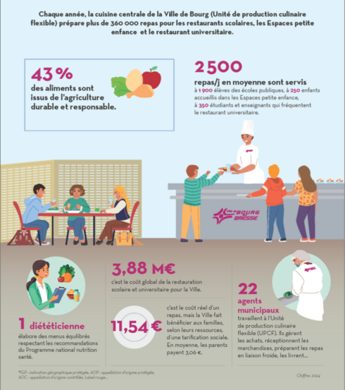 - Réduction du gaspillage alimentaire : début 2020, la Ville a signé une convention avec la Banque Alimentaire pour faire don des surplus de repas. Elle est aussi engagée dans un travail au quotidien pour ajuster les quantités produites et les recettes.