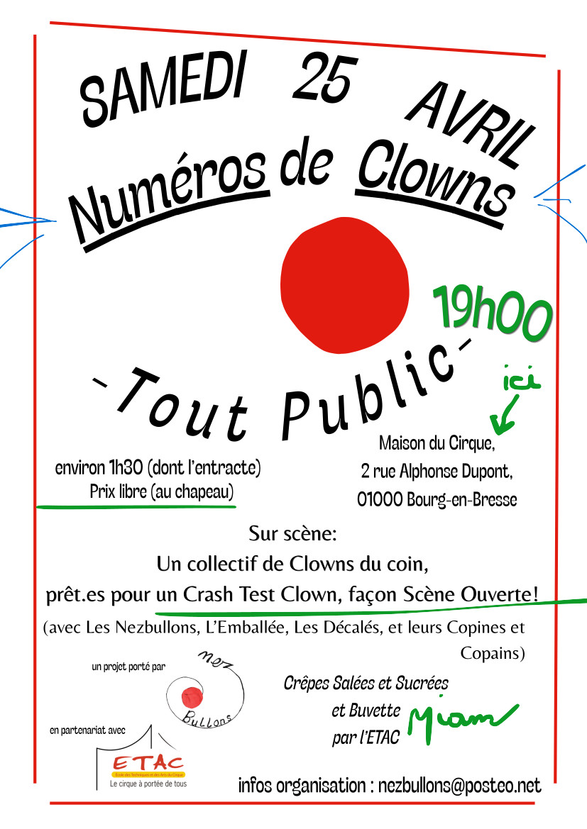 Sur scène : Un collectif de Clowns du coin, prêt.es pour un Crash Test Clown, façon Scène Ouverte!(avec Les Nezbullons, L’Emballée, Les Décalés, et leurs Copines et Copains)